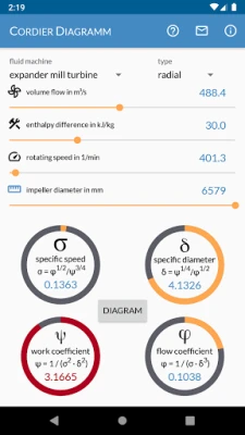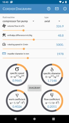 De gebruikersinterface is ontworpen met het oog op snelheid en gebruiksgemak. Voer uw gegevens of geometrie moeiteloos in via interactieve schuifregelaars. Wissel naadloos tussen invoer en uitvoer met een simpele tik, wat zowel voorwaartse als omgekeerde berekeningen vereenvoudigt. De resultaten zijn direct zichtbaar via dezelfde intuïtieve schuifregelaars, aangevuld met cirkelvormige voortgangsbalken die u een helder overzicht geven van de dimensieloze getallen binnen hun typische bereik. Visualiseer uw huidige berekening direct in het Cordier Diagram (beta) en krijg een dieper inzicht in de prestatiekenmerken van uw ontwerp.