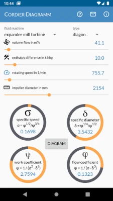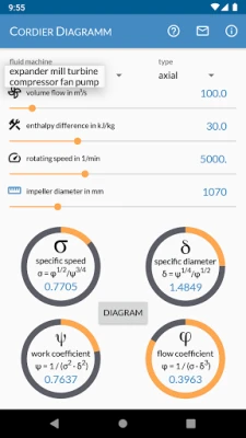 Cordier Diagram is uw essentiële tool voor turbomachinerieontwerp. Bepaal snel het type (axiaal, diagonaal, radiaal) van compressoren, pompen, ventilatoren, turbines of molens. Bereken diameters op basis van volumestroom, specifieke enthalpie en snelheid, of voer omgekeerde berekeningen uit voor volumestroom en snelheid bij een gegeven geometrie.