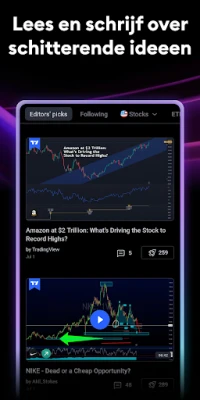 Maar TradingView is meer dan alleen een databron; het is ook de thuisbasis van 's werelds meest actieve gemeenschap van handelaren en beleggers. Maak contact met miljoenen gelijkgestemden, deel inzichten en verrijk uw strategieën door te leren van de ervaringen van anderen. Dit sociale element wordt naadloos aangevuld met geavanceerde grafische tools die de standaard zetten. Ervaar superieure grafieken die zelfs desktop handelsplatforms overtreffen, compleet met alle functionaliteiten en instellingen die u kent en verwacht. Kies uit meer dan tien unieke grafiektypes, van basislijnen tot gespecialiseerde Renko- en Kagi-grafieken die prijsbewegingen accentueren, en analyseer de markt met een uitgebreide suite van indicatoren, strategieën en tekenobjecten zoals Gann en Elliot Wave.