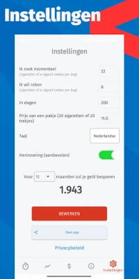 De kracht van deze aanpak ligt in de personaliseerbare instellingen. Bij het opstarten definieert u uw huidige dagelijkse verbruik, stelt u een realistisch streefgetal in (zelfs nul als volledig stoppen uw doel is), en kiest u het aantal dagen waarbinnen u dit resultaat wilt bereiken. Voer ook de kosten van een pakje sigaretten in, en de applicatie zal de potentiële besparingen visualiseren. Deze op maat gemaakte route helpt u stap voor stap vooruit, of u nu een drastische verandering wilt of een geleidelijke vermindering. Start de timer en laat het systeem u begeleiden naar een rookvrij bestaan, of op zijn minst een leven met aanzienlijk minder rookmomenten.