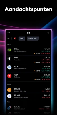 TradingView transformeert uw mobiele apparaat in een krachtig financieel centrum. Ontdek een wereld van marktinformatie, gevoed door directe en betrouwbare data van professionele bronnen. Of u nu geïnteresseerd bent in aandelen, futures, de dynamiek van Forex-markten, de nieuwste cryptotrends of CFD's, TradingView biedt u realtime toegang tot een ongeëvenaarde reeks financiële instrumenten. Volg moeiteloos toonaangevende wereldwijde indices zoals de S&P 500, NASDAQ Composite, Dow Jones, DAX en NIKKEI 225, en blijf op de hoogte van wisselkoersen, grondstofprijzen, obligaties en ETF's. Deze diepgaande dekking zorgt ervoor dat u altijd een volledig beeld heeft van de mondiale economische bewegingen.